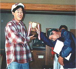 97’マッディーズトーナメント年間報告書 まずは、みなさんお疲れさまでした。今年もバスを求めてボートや車で走りまわってい るうちに、一年が過ぎてしまいましたね。シーズン中は、あちらこちらのト−ナメントで 大会荒らしをしていたマッディーズのみなさんも、シーズンオフとなった今頃は、ホっと ている人、気がぬけてボーっとしている人、来シーズンに向けてポイント探しをしている 人と、さまぎまなオフをお過ごしでしょう。 それでは、今年のトーナメントの内容を報告します。 第1戦 4月13日 1643g lO位 場所:白浜ドックの石積み周り リグ:ヘビキャロ ルアー:ズームのミートヘッド(ウォーターメロンシード) ダイリツのミニチューブ(スモークシルバー) この時期の北浦は、スポーニングの真っ只中、産卵前のバスを狙うには ワンド内や石積み周りで風の影響を受けにくい所がよいが、トーナメント 前のプラでは、湾度内のポイントを見つけられず、当日は確実にバスを 狙える石積みで勝負しました。結果、10本のバスをキャッチしましたが キッカーが入らず、はずしました。 第2戦 6月22日 2149g 2位 場所:川、水路 リグ: ジグヘッド ルアー:エコギアストレート(ブラック) 6月の北浦は、スポーニングも終わりビックなバスは釣りにくく、がんがん アタックしてくるのは400グラム前後の小バスばかりで、トーナメントの戦略を たてるには、難しい時期です。今年は、恵みの台風が来てくれたおかげで増水 した為、川、水格のみを狙う戦略で勝負しました。結果、優勝は逃しましたが正解でした。 第3戦 8月17日 980g 12位 場所:白浜ドックの石積み周り リグ:ヘビキャロ ルアー:ダイリツのミニチューブ(スモークシルバー) 今回は、大はずし。 朝一から検量係となっていたので、沼尾で釣りをしましたがノーバイト、気を 取り直し、まずはキーバー2本を捕ろうと白浜に走った。なんと一投目で960 gをゲット。「よっしゃ、もう1本」と粘ってみたが後が続かない、しかたなく 数力所のポイントをまわってみるが釣れない。終了時間が近づきあせってくると 北浦が見えなくなる。結局この日は1本のみ、情けない...。 第4戦 10月26日 1816g 5位 場所:中里 リグ:スピナーペイト ルアー:エバーグリーン SRミニ1/4 今回のリグを見て、(百目鬼さんがスピナーベイト?)と思った方が多いので はないでしょうか。実は今、スピナーベイトにはまっています。今年は私用が多 く、なかなか北浦へ行く事が出来なかったので、地元の小貝川で釣りをする事が 多かった。小貝川は、増えはじめの小バスが多いため、どんなルアーにも反応し 数多く釣ることが出来た。どうせ釣るなら、ふだん使わない苦手なルアーで釣っ てみようと思い、まずは苦手No.1のスピナーベイトから投げつづけ、最初に ヒットしたのが40upでした。私はこの1本ではまってしまった。そうなると この釣り方(水面直下のスローリトリーブ)を北浦で試したくなり、いくつかの ポイントで投げてみると、釣れるんだな、これが。この時見つけた場所が、今回 入った中里だったんです。 以上が私のマッディーズトーナメントでの内容でした。 来年も狙うぞ「優勝」!