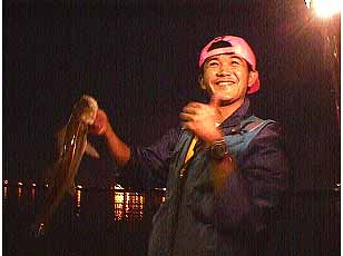 8/20kashimakou Night,SeaBassHunting 3! muddys号 in Kashimakou 今日はウォーターランドの三枝君を乗せ いざ、鹿島港! 「行くぜー三枝ーっ!」、「おーっ」 昭和産業付近で1時から2時30分頃まで粘るが バイトは有るものの、今一つ乗らない。 信越化学前の排水口でブラザーようやくゲット! でも次がバイトだけで2匹目が続きません、 乗りは悪いのですが、さすがツボを心得ているブラザー 暫くポイントを暖め、再度ゲット! 「よし来たー!」 次は鹿島電解付近でゲット おおーっちょっと大きいぞ60弱だな 「なにーまたかよー」と兄 なんだかんだで今日は5〜6本掛けている ふっふーん、おらが1バーン「得意、とくい」! 確かに俺達は、あ然としていた。....私&三枝 散々見せつけられてはいたが、密かにブラザーの釣法を得解く そしてゲット!いやっほー「竹中直人調」 いつもの鉄塔で最後粘るがブラザーがアイナメ1匹だけ。 そして夜が明ける、はいっ今日はここまで!納竿。 後は近所にお裾分け、 みんな食べてしまいましたとさ。 本日の簡単なデータ、 8/20時間0時40分〜5時30分まで、 潮、中潮、19日から干潮22時53分。20日満潮、4時34分。干潮、11時18分。 場所はいつもの排水口と灯りの下で 今日は信越科学前の排水口と 鹿島電解前付近の灯りの下での釣りをしていました。 ヒットパターン、肝は!、今日は、釣りはしやすいのですが、 感じんの釣り状況がベタ凪であまり良くなく、シーバスもバイトは有るものの、 ノリがいま一つである、でも排水口は若干アタリが続いてました。 シーバスのポイントも同じ 灯りの下で、明暗の際、ギリギリの表層を スローにリトリーブした。 一度ヒットしてしまうと次があまり続きません、 ヒットしたのも、そこに居着きのバスが主にであると思いました。 それと、もうひとつ、我先!これが一番 ルアーはジグヘッドでジャクソンのポップンミノーのパール色、 スライダー、バスグラブ、シャッドテールのパール色。 ではまた、