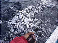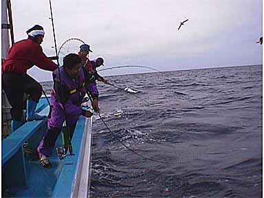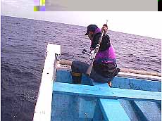 シイラゲーム9/28 行って来ました。みんなで初めてのシイラフィッシングへ 先週まで台風の影響で海のしけが続き28日日曜日は大丈夫かな? と思っていたのですが、土曜日にはおさまり28日は出船できました。 期待を胸に、当日前の日「初めてのシイラをどういうふうに釣るのだろう?」 「タックルは何が良いのだろう?」「釣れなかったら怖いな?」 と色々なことを考えてしまう。 「バスタックルで良いんだってサー」 「ええーいつも使ってるのでいいのー?うっそだーもたないんじゃないのー」 「ミデアムクラスの6.5フィート前後のバスロッドでラインは10.12ポンド以上、 ショックリーダーは6号25ポンドらしいよ」 大丈夫かなー? と言ってましたが当日になりまして、ヒャッホーの ソルトウォーターゲームフィッシングへGoー 不動丸へ乗り込みました。 メンバー右から荒川、倉持、西野、細谷君と私、大久保の5名 同船者は東京から今日初めて会った、二宮、内田君の2名 「今日はよろしくお願いします。又別の日にも一緒に釣りましょう。」 マッディーズは知っていたそうです。嬉しいです。 「シイラでなくてもルアーで釣れるもんだったらなんでもいいね」 「食えるっていうのが良いじゃない、ブラックと違ってさ」 「良かったねーっ今日は船出れて。釣れるといいなー」 「釣れなくても良いカー初めてのソルトウォーターだし」 なんて言ってました。 ポイントは流木などの障害物、それとドラッキング「トロール」しながら流していきます。 しばらく探すけどなかなか障害物が見つかりません 今日は駄目かなー?と思いきや、船長、流木発見「小さいね」 ホントに釣れるのかな、あんなに小さな流木に着いているのかな? 思いきや内田君が「フッ、フィッシュ!} おおーっホント着いてるよ、いたよシイラだ! よしゃー! すると、船上は一変した! あれよあれよの入れ食い状態! 「赤丸急上昇!」 メンバーがワッセワッセと釣り上げる! なんと1人り10〜20本、めじ鮪も混じって7人で100本以上の釣果でした。 サイズは50p前後と小さかったですけど バスタックルで楽しむには充分なゲームでした。 お昼近くまで楽しんで、ヘトヘトになってしまった 本部へ戻り早速今日の獲物を肴に乾杯したアルコール が入りそして疲れとともに皆死んだようにくたばってしまった。 ちょっと笑える。 見て!このずたずたのアスリート、箱からだした今日、 使ったのはこれだけだった。 本日簡単なデータ 潮、中潮。南西の風2位、AM5時出船7時30頃流木を見つけ当たる。 ヒットルアーはナチュラルな「ブルー系」のルアー、トップでもワームでもよし、 ちなみに仲間はエコギアーパワーワームミノーのシャッドテール5と1/2サイズ 50p前後でほとんどメスのようだ、メータークラスがくるとタックルが結構心配だ。 ルアーも解ってくると食いついてくるより、つついてしまい最後は見向きもしなくなる そしたらまたトロールしながら障害物を探していく。 釣船不動丸