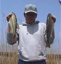 よ〜」という言葉を思い出し、果たして一週間たってもまだ通用するだろうかと思いな がらも「とにかく、風裏になっていたら志崎に行こう」と心に決めて大会に臨みました. 当日、風裏になるどころか無風状態。少し悩みながらも、「まあ、風がないんだから 同じだろう」と本命のポイントヘ。早速7号オモリのヘビキャロ(ナスキャロ)をセッ トして釣りを始めたところ、3投連続でヒット。しかしどれも600g前後のサイズ. その後もサイズが伸びないので、ワームを2.5インチのパドルテールから4インチの ミートヘッド(チャートリュース)に変えたところ、900gがヒット。チャート系の カラーのほうが大型の反応が良いように感じました. 雲が途切れて日が照り始めると、アタリが遠のいてしまいました。それでも、もう少 し粘ろうとキャストを続けていると、小さいが力強いバイト。すかさずフッキングした が食い込みが浅いためかすっぽ抜けてしまいました。結構大きい魚の感触だったので、 5分ほどその場所を休め、ミートヘッドも頭を2センチほどちぎって再度同じところヘ キャスト、やっぱりといった感じで食ってきたのが今回のキッカーとなった1.4kg でした.時間は7:30頃だったと思います。 その後更に魚がスローになり、ワームを割と細めのもの(アングラーズチョイス・ベ ビースキニーシェイカー:今は売られていない)にして、カラーもパンプキン系のもの に変えて10:00頃何とか1kgを追加するこ・とができました. ちなみに、アクションは2回ほど小さめのトゥイッチを加え長めの(5〜10秒)ポー ズをとるといったもので、バイトはすべてポーズの最中にありました. 今回のトーナメントは払にとっては出釆過ぎの結果となりました。今年から新たに始 まるマッディーズ・クラッシック出場を目指してこれからもがんばりたいと思います。 第3位は市塚雅紀選手! 兄ちゃん初参加から飛ばしまくっています、マリーナで1271グラムを筆頭に 終わってみればトータル5本5597グラムでボートでも優勝出来そうなウエイト 最後立て続けに3本、1100オーバーは驚異てきでした。